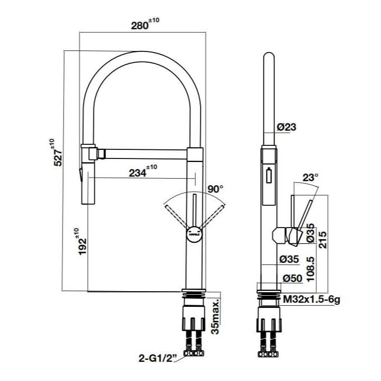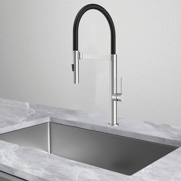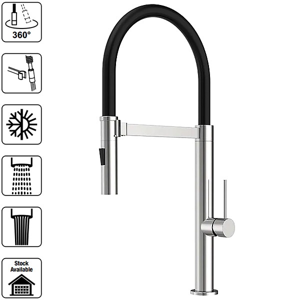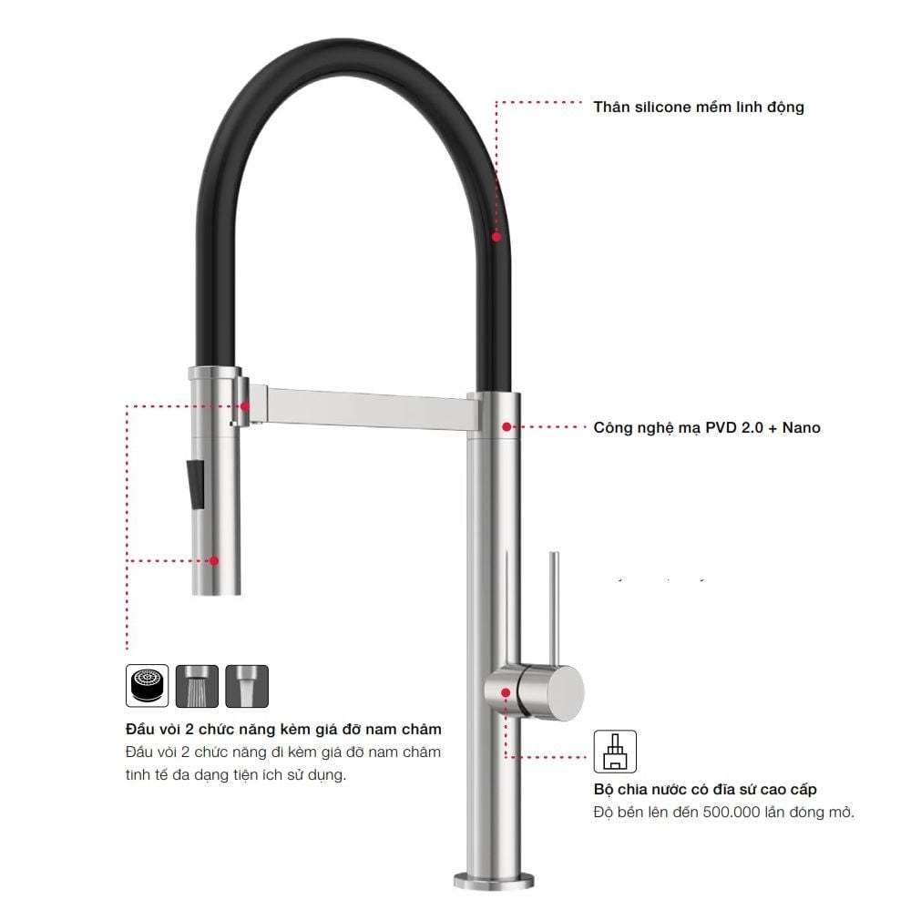 – Thân vòi Silicone linh động có thể kéo dài lên đến 50cm, di chuyển đến mọi góc của chậu rửa