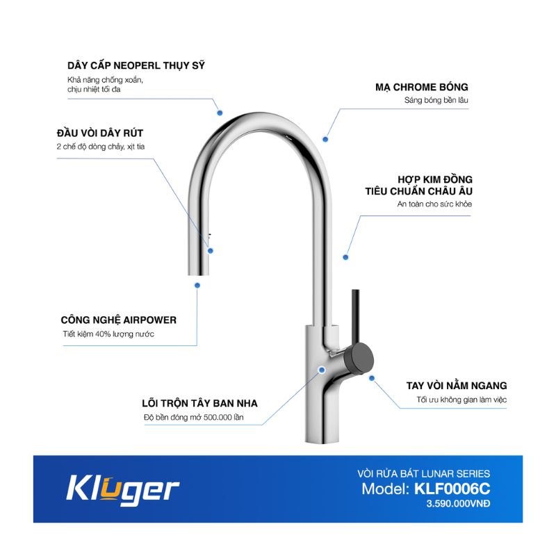 Vòi Rửa Bát Kluger KLF0006C – Dòng LUNAR Series, Thiết Kế Bán Nguyệt Sang Trọng, Tiện Ích Hiện Đại